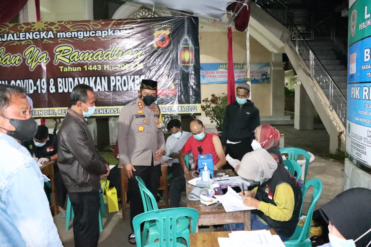 Majalengka – medialidikkrimsus-ri.net – Sebagai upaya percepatan vaksinasi, Polres Majalengka terus menggelar vaksinasi malam hari, kini di Masjid Al Hidayah Desa Talaga Wetan Kecamatan Talaga Kabupaten Majalengka Jawa Barat. Rabu (6/4/2022) malam. Di bulan suci Ramadhan tahun ini pelaksanaan vaksinasi kami laksanakan malam hari tersebut menyasar para jamaah yang melaksanakan ibadah shalat tarawih. Ungkap Kapolres Majalengka AKBP Edwin Affandi. Menurutnya, vaksinasi yang dilaksanakan di Masjid besar tersebut bertujuan untuk mempermudah masyarakat mendapatkan vaksin dosis booster. “Seperti yang kita ketahui bersama, vaksin booster menjadi prioritas karena bagi warga yang akan mudik…