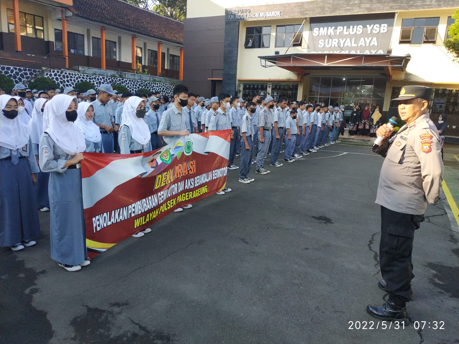 Tasik Kota – medialidikkrimsus-ri.net – Kapolsek Pagerageung Polres Tasikmalaya Kota AKP Erustiana menghadiri Deklarasi Penolakan Genk Motor di SMK Plus YSB Suryalaya Kecamatan Pagerageung Kabupaten Tasikmalaya, Selasa (31/05/22) “Hal ini dilakukan dalam mendukung pelaksanaan Ops Libas dan Ops Bina Kusumah Lodaya 2022,” ungkap Kapolsek Ia menambahkan bahwa hal ini sebagai upaya mewujudkan Harkamtibmas di kalangan pelajar agar tidak terjerumus ke pergaulan bebas seperti berandalan bermotor yang meresahkan masyarakat. Sementara itu Kepala Sekolah SMK Plus YSB Suryalaya H Deny Gandasaputra mengapresiasi kegiatan tersebut sebagai upaya Polri dalam menanggulangi kenakalan remaja dikalangan…