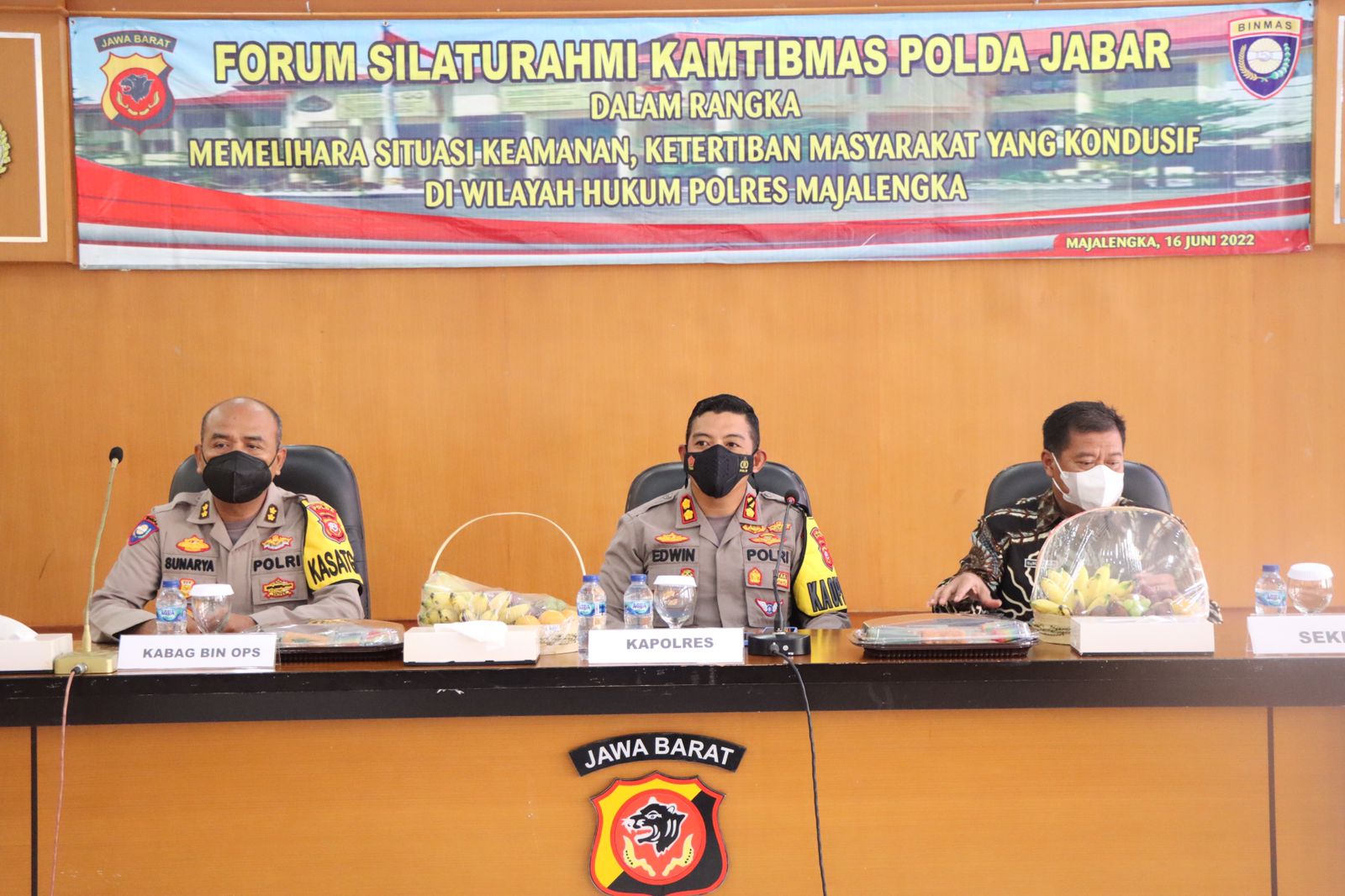Majalengka – medialidikkrimsus-ri.net – Bertempat di Aula Kanya Wasistha Polres Majalengka, Kapolres Majalengka AKBP Edwin Affandi Pimpin kegiatan Forum Silaturahmi Kamtibmas Polda Jawa Barat dalam rangka Memelihara Situasi Keamanan, Ketertiban Masyarakat yang Kondusif di wilayah Hukum Polres Majalengka, Kamis (16/6/2022). Forum Silaturahmi Kamtibmas Kapolres Majalengka didampingi Sekda Kabupaten Majalengka Drs. H. Eman Suherman, Kabag Binopsnal Dit Binmas Polda Jawa Barat AKBP Sunarya dan dihadiri Wakil ketua Komisi III DPRD Majalengka Suparman, kesbangpol dr. Heri Rahyubi, Kasi Kurikulum Disdik Memet, Kasat Pol PP Drs. Toto Prihatno, beserta para tamu undangan Tokoh…