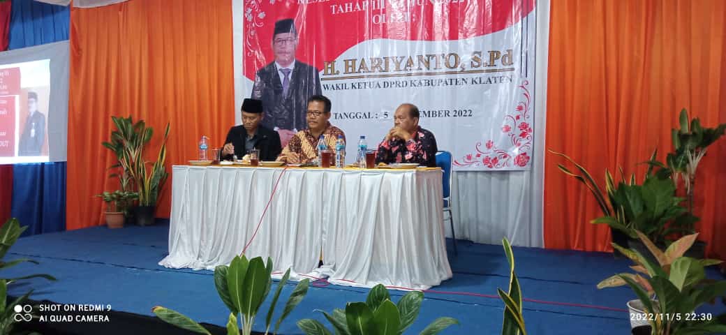 Klaten – medialidikkrimsus-ri.net – Masa reses adalah masa dimana anggota DPRD bekerja diluar gedung atau diluar kantor, waktu reses dipergunakan oleh anggota dewan menemui atau melalukan kunjungan ke konstituen atau daerah pemilihan ( Dapil) untuk menjalankan tugas tugasnya sebagai wakil rakyat. Sama halnya yang dilakukan oleh salah satu Wakili DPRD Kabupaten Klaten Haryanto yang juga legislator dari Partai Gerindra melakukan kunjungan ke dapilnya tepatnya di Kantor Desa Butuhan Kecamatan Delanggu, Kabupaten Klaten Jawa Tengah Sabtu (5/11/2022) malam. Saat ditemui media ini usai acara Haryanto mengatakan bahwa ini adalah salah satu…