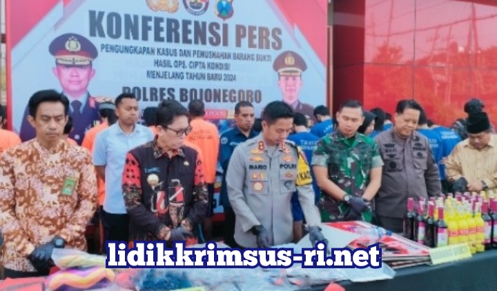 LidikKrimsus-ri.net – Polres Bojonegoro gelar konferensi pers pengungkapan kasus dan pemusnahan barang bukti hasil operasi cipta kondisi menjelang Tahun Baru 2024, Kamis (28/12/2023). Kegiatan yang juga oleh Pj Bupati Bojonegoro, Dandim 0813, Kajari Bojonegoro, Wakil Ketua Pengadilan Negeri Bojonegoro, Ketua FKUB Bojonegoro. Kapolres Bojonegoro, Mario Prahatinto mengatakan ihwal pengungkapan kasus hari ini terdiri dari tiga fungsi, yakni dari Sat Reskrim, Sat Narkoba dan Satlantas. Dari Sat Narkoba dalam kurun waktu 1 tahun terhitung dari Januari sampai dengan Desember 2023, telah melakukan pengungkapan peredaran dan penyalahgunaan narkoba dengan tersangka sebanyak 70…