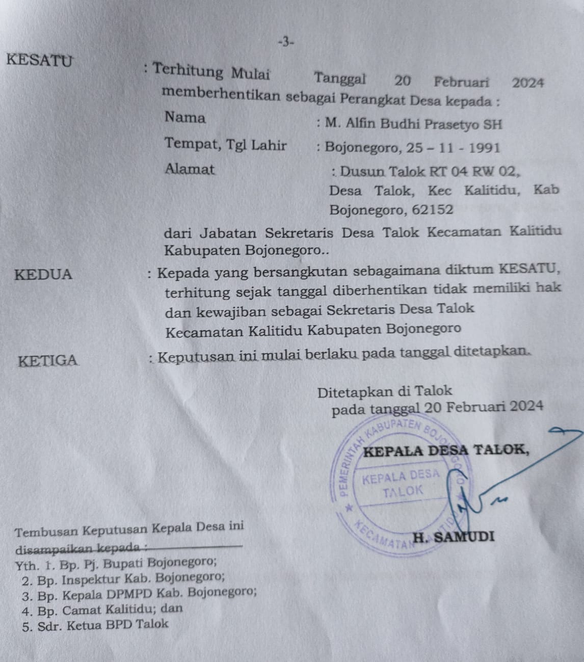 Baca SelengkapnyaKepala Desa (Kades) Talok Dengan Tegas Pecat M. Alfin Budhi Prasetyo, SH dari Jabatan Sekretaris Desa (Sekdes).