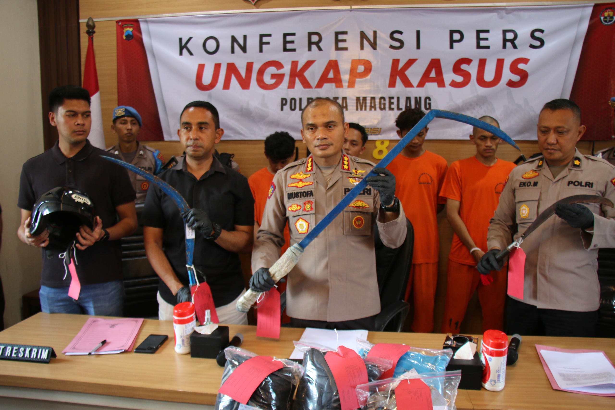Magelang, Jateng || Peristiwa tawuran di wilayah Desa Candiretno Kecamatan Secang Kabupaten Magelang pada Sabtu (15/06/2024) melibatkan dua kelompok remaja mengakibatkan 2 (dua) remaja menjadi Korban. Kejadian itu diawali saling tantang dua kelompok tersebut melalui media sosial Instagram (IG). Hal itu diungkapkan Kapolresta Magelang Polda Jawa Tengah Kombes Pol Mustofa, S.I.K., M.H., didampingi Kasatreskrim Rifeld Constantien Baba, S.I.K, M.H. dalam Konferensi Pers di Ruang Media Center Polresta Magelang, Rabu (19/06/2024). Dijelaskan kronologi kejadian, pada hari Sabtu tanggal 15 Juni 2024 sekitar pukul 22.30 WIB. Di mana kelompok Tersangka yaitu Geng…