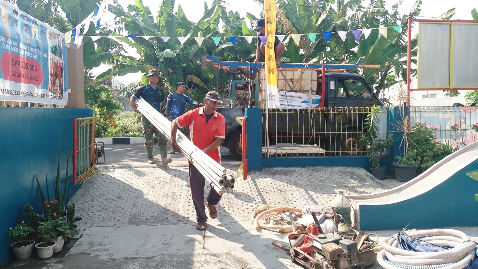 Lidikkrimsus-ri.net – Yogyakarta – Turut berkiprah mbangun desa, Anggota tim Satgas Tmmd Reguler ke-121 Kodim 0734/Kota Yogyakarta kompak menyiapkan bahan material untuk melakukan rehab infrastruktur umum warga masyarakat di wilayah RW. 08 Kp. Mrican Kel. Giwangan Kem. Umbulharjo Kota Yogyakarta, Senin (29/7/2024). Kesiapan pembangunan rehab fasilitas umum Bale Manunggal tidak terlepas dari penyiapan bahan bangunan, terlihat kebersamaan anggota TNI dan Polri yang tergabung sebagai anggota tim satgas TMMD, saling bahu membahu yang terbalut dalam semangat memberikan sumbang sih terbaik untuk kemaslahatan warga masyarakat. Dalam kesempatan tersebut Serma Heri selaku katim…