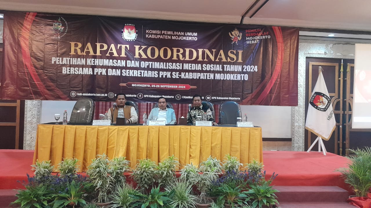 Mojokerto – Demi terciptanya Pilkada serentak tahun 2024 yang akan diselenggarakan pada tanggal 27 November 2024 mendatang, KPU Mojokerto gelar Rapat Koordinasi Pelatihan Kehumasan dan Optimalisasi Media Sosial Tahun 2024 bersama PPK dan Sekretaris PPK Se Kabupaten Mojokerto. Rabu (25/09/24). Hadir dalam kegiatan tersebut antara lain : 1. Bpk. Afnan Hidayat (Ketua KPU Mojokerto) 2. Bpk. Muslim Bukhori (Div. Sosialisasi Pendidikan Pemilih, Partisipasi Masyarakat Dan SDM KPU Kab. Mojokerto) 3. Bpk. Achmad Febrianto (Div. Perencenaan Data dan Informasi KPU Kab. Mojokerto) 4. Bpk. Rendy Oki Saputra (Div. Teknis Penyelenggaraan KPU…