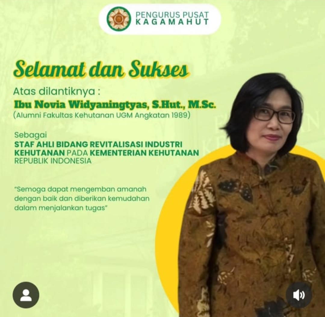 Seluruh Jajaran Pengurus dan Pembina Lidik Krimsus RI Mengucapkan Selamat Atas Dilantiknya Novia Widyaningtyas, S. Hut.,M.Sc. Sebagai Staf Ahli Bidang Revitalisasi Industri Kehutanan Kementerian Kehutanan Republil Indonesia, Semoga dapat mengemban amanah dengan baik dan diberikan kemudahan dalam menjalankan tugas. ( alumni Fakultas Kehutanan UGM Angkatan 1989 )