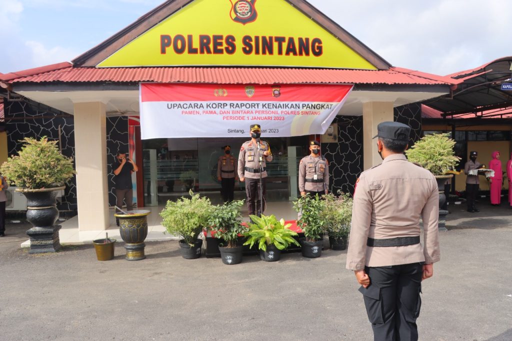 Kepolisian Resor Sintang menggelar upacara Korps Raport kenaikan pangkat para personel yang langsung dipimpin oleh Kapolres Sintang, AKBP Tommy Ferdian di Halaman Mapolres Sintang, Senin 2 Januari 2023.