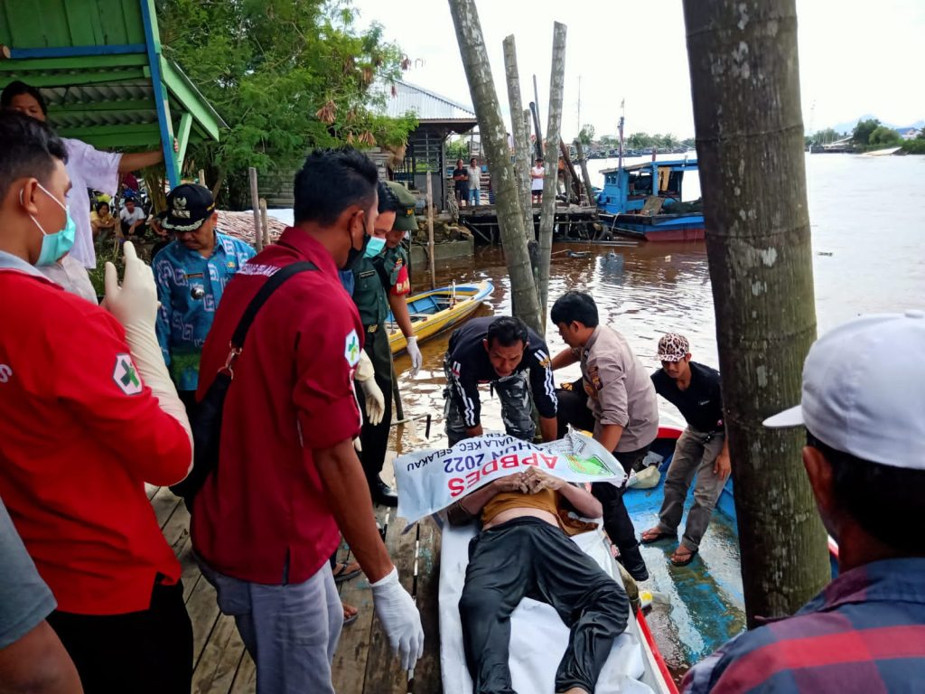 Sambas Medialidikkrimsus-ri.net Anggota Koramil 06/Selakau Sertu Marta Dinata bersama warga mengevakuasi korban tenggelam yang berlokasi di Sungai Kuala Dusun Danau, Desa Kuala, Kec. Selakau, Kab. Sambas, Kamis (08-12-22).