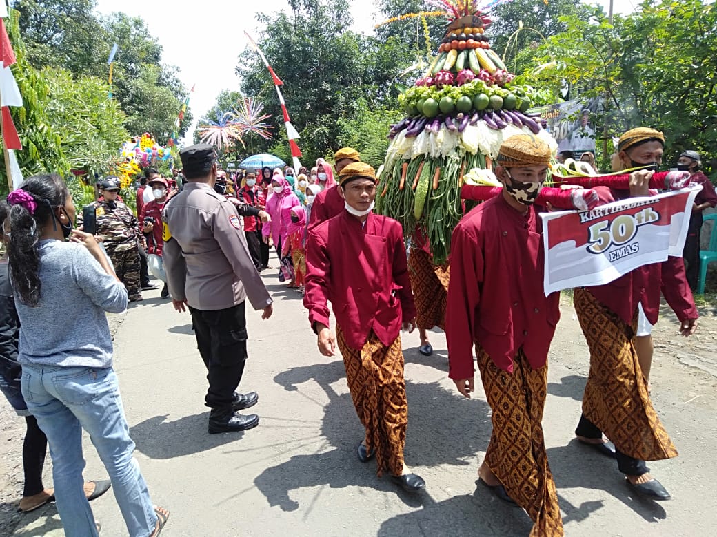 “Sedekah bumi yang di laksanakan berupa arak arakan gunungan yang berisi hasil panen masyarakat desa Kartikajaya dan di perebutkan oleh warga masyarakat. Dilanjutkan pentas seni dari anak anak SD bleder dan TK Cendrawasih serta ibu ibu PKK desa Kartikajaya,” ujar Dewi Melinda