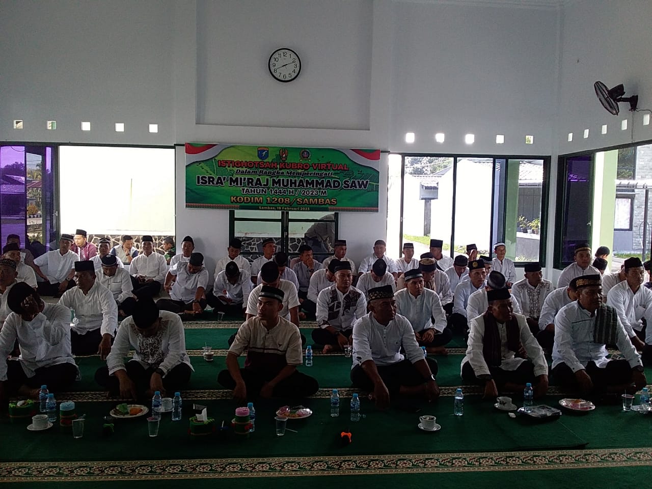Kegiatan istighatsah secara virtual di laksanakan di masjid Mujahidin Kodim 1208/Sambas, Jl. Tabrani, Desa lumbang, Kec. Sambas, Kab. Sambas, dihadiri oleh anggota Kodim 1208/Sbs yang beragama Islam bersama Forkopimda beserta staf dan juga tokoh agama kabupaten Sambas dalam rangka memperingati Isra’ Mi’raj 1444 H, dengan diawali dengan sholat Subuh berjamaah.