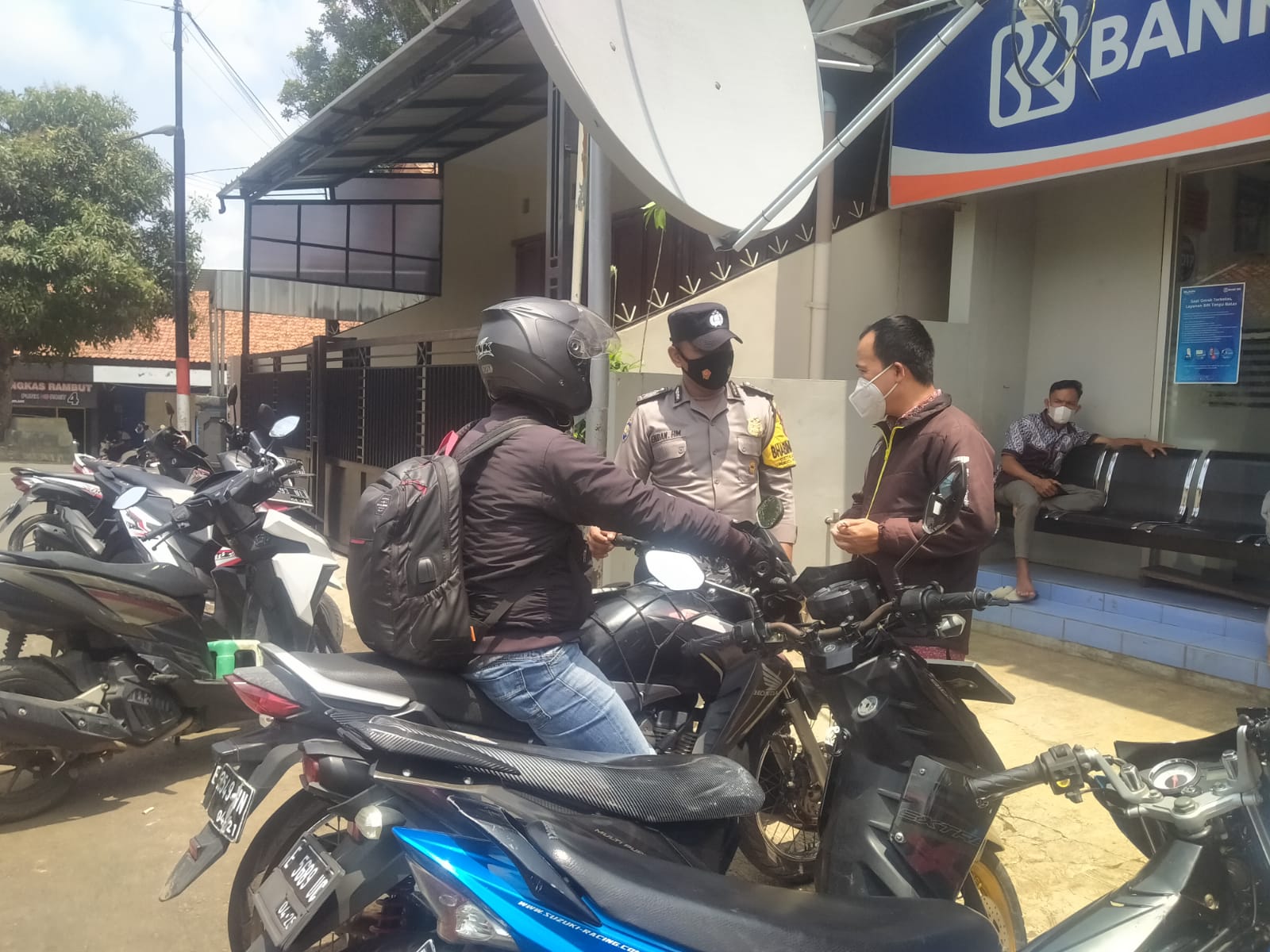 Bhabinkamtibmas Penyampaian kepada pengendara sepeda motor yang tidak menggunakan masker pada saat kepasar disuruh pulang kerumah atau membeli masker warung, guna mencegah penyebaran covid 19.