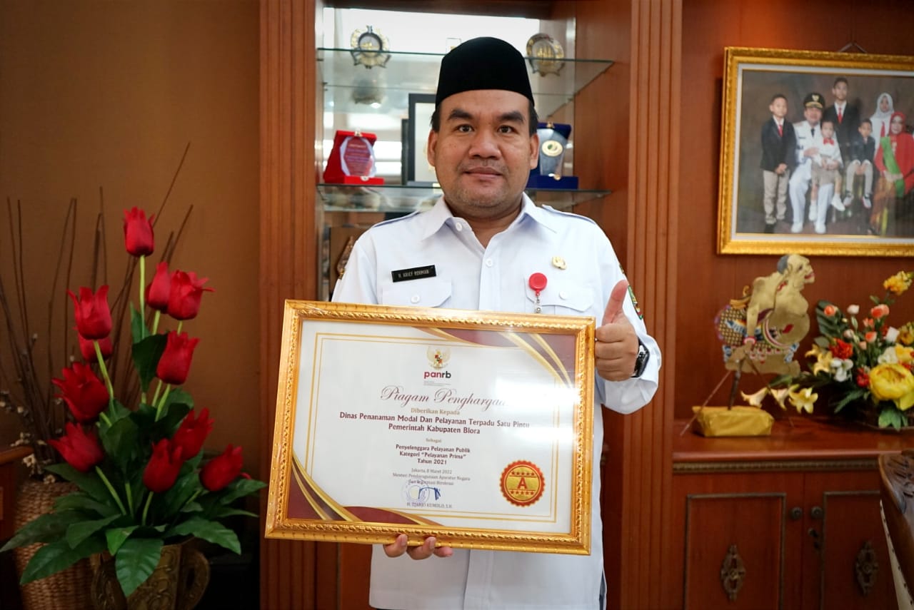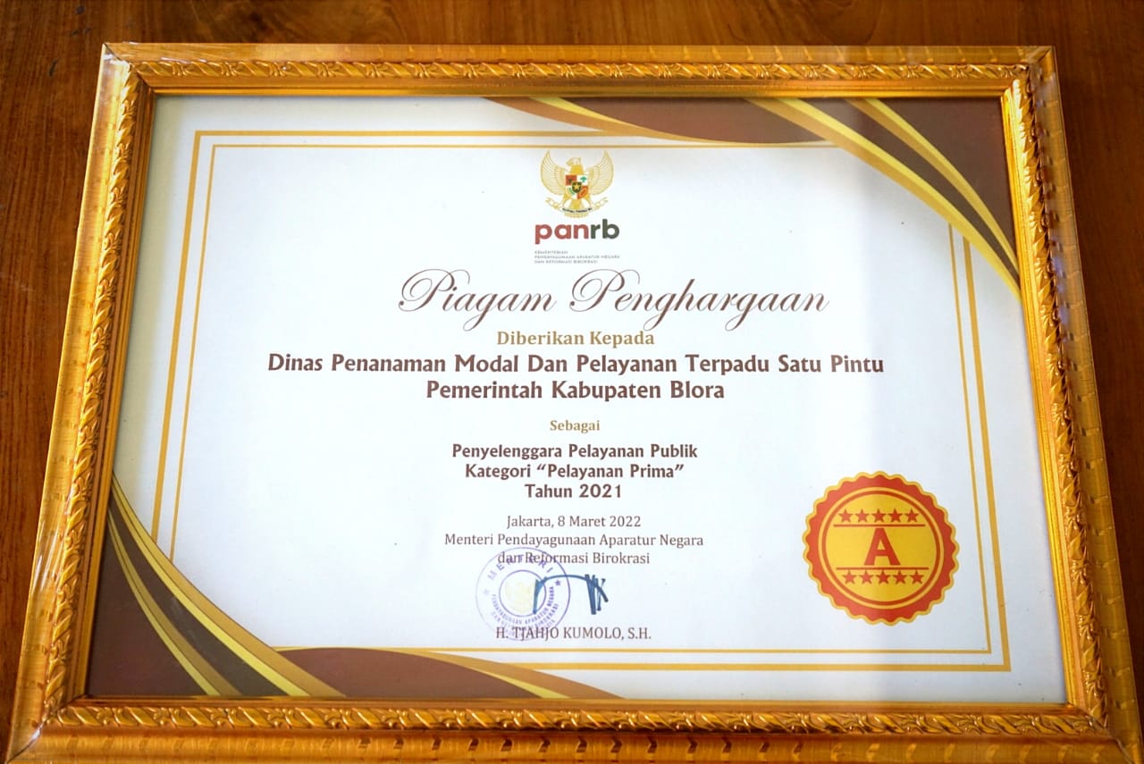 Yang mana Dinas Penanaman Modal dan Pelayanan Terpadu Satu Pintu (DPMPTSP) Blora memperoleh Predikat “A” kategori Unit Penyelenggara Pelayanan (UPP) Pelayanan Prima.