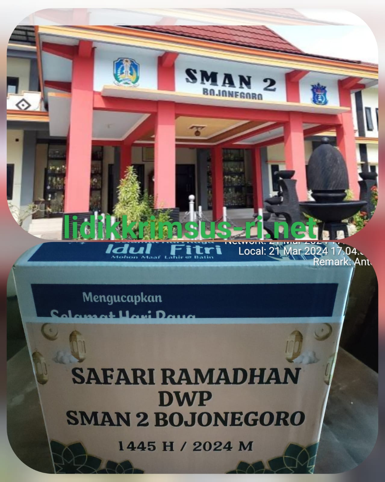 Seperti tahun sebelumnya, namun untuk giat Safari Ramadhan tahun ini, sasarannya adalah murid yang belum mendapatkan dari tahun kemarin. Dan giat Safari Ramadhan SMAN 2 ini berjalan terus serta berkelanjutan.* DWP Bojonegoro Jatim, lidikkrimsus-ri.net // Seiring diperjalanan bulan suci Ramadhan 1445 H tahun 2024 M, Kepala Sekolah SMAN 2 kabupaten Bojonegoro Jawa Timur bapak Muhammad Ma’ruf. S.Pd. M.pd bersama sejumlah guru, kemarin hari Kamis tanggal 21 Maret 2024, melakukan giat Safari Ramadhan melalui Dharma Wanita Persatuan (DWP) dengan berbagi bingkisan ucapan Selamat Hari Raya Idul Fitri kepada sejumlah murid dan/atau…