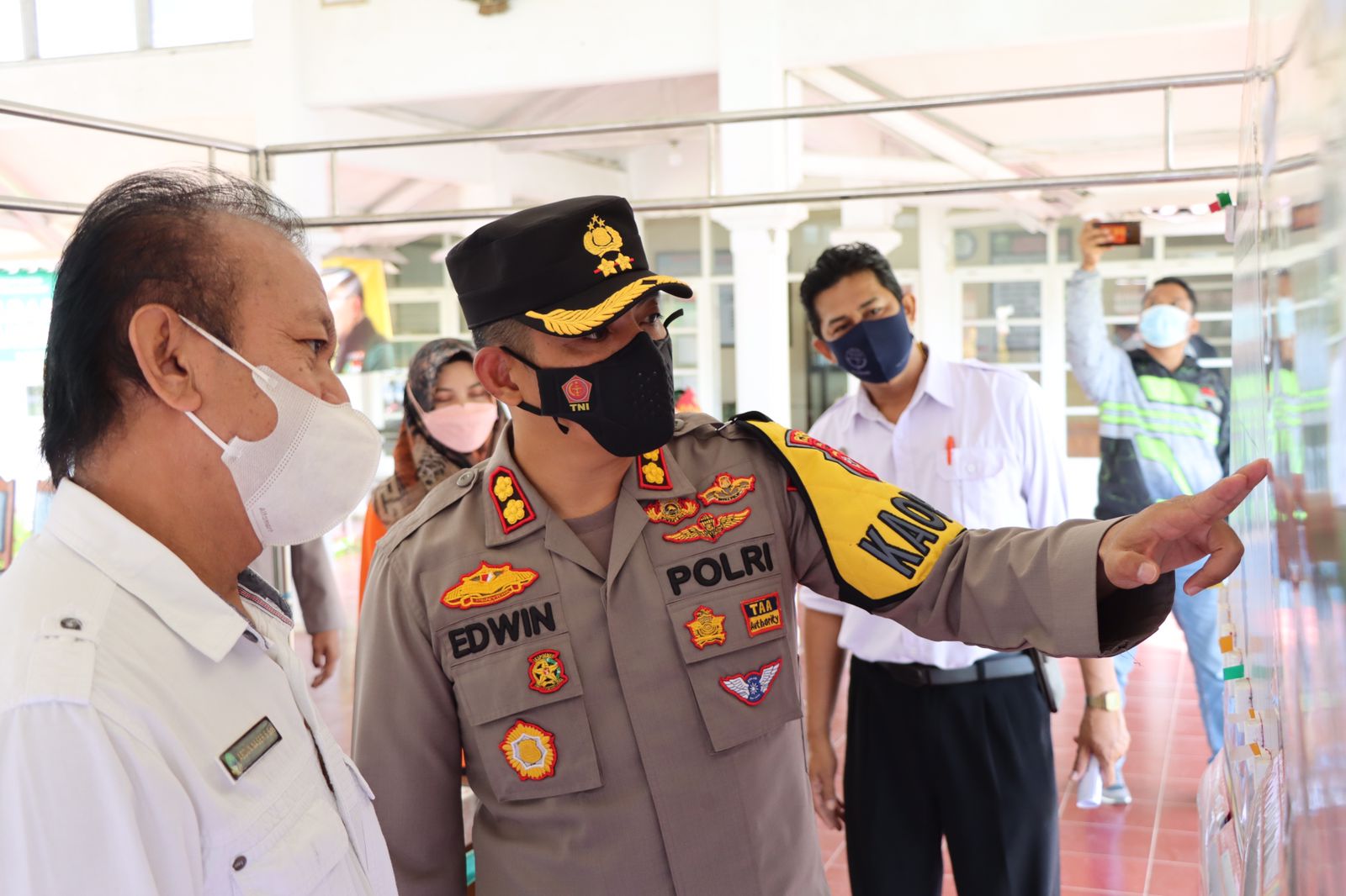 Kapolres Majalengka AKBP Edwin Affandi didampingi Kasat Intelkam AKP Jonaedi dan Kasubsi PIDM Sie Humas IPDA Hendra Susilo mengecek sarana dan prasarana di Posko Pemberlakuan Pembatasan Kegiatan Masyarakat (PPKM) Di Wilayah Kabupaten Majalengka,Rabu (23/2/2022).