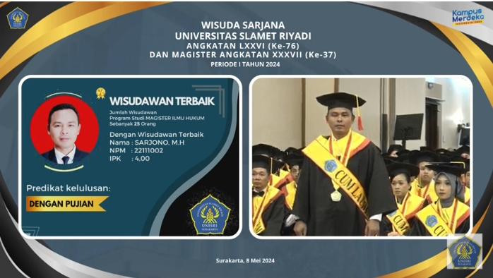 – Wisudawan Terbaik yaitu saudara Sarjono, S.Pd., S.H., M.H.