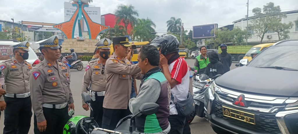 “Hari ini selain melakukan penertiban kepada para pelanggar lalu lintas, kami juga melaksanakan pembagian helm dan sembako kepada para pengemudi transportasi umum, ojol, opang dan masyarakat yang melintas.” Ujar Kapolres