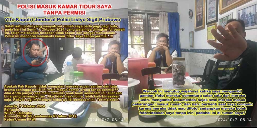 Saat Wilson Lalengke meminta surat tugas, salah satu anggota polisi menunjukkan surat dari pimpinannya dengan logo Polda Metro Jaya. Namun, peristiwa tak menyenangkan terjadi ketika ia hendak mengambil kacamata di kamar tidurnya. Seorang anggota polisi berbadan gemuk dengan pakaian kaos lengan panjang hitam keabuan, tanpa izin, mengikuti wartawan senior itu ke dalam kamar tidur dan membuka pintu kamar.