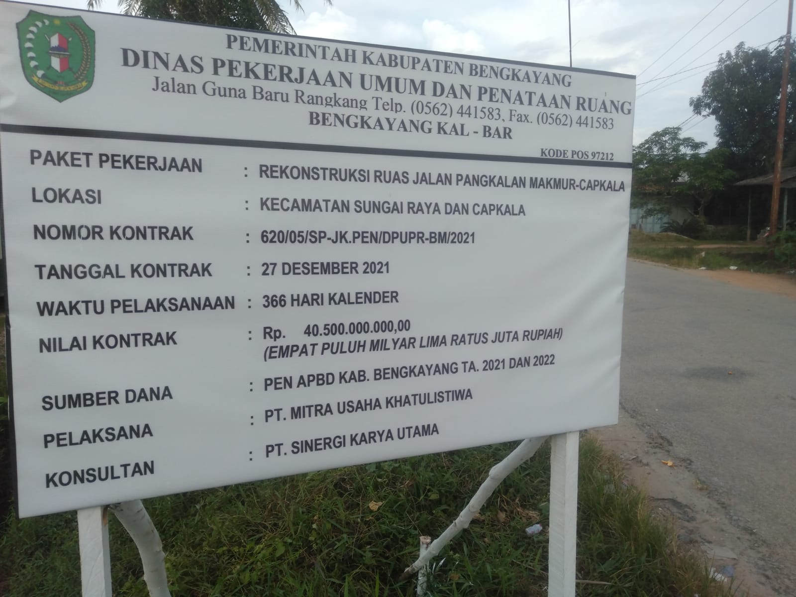 Hasil pantauan Tim Media di Kabupaten Bengkayang terkait pembangunan jalan Rekonstruksi ruas jalan Pangkalan Makmur – Capkala Kecamatan Sungai Raya Kepulauan yang menelan anggaran Rp. 40. 500.000.000 ( empat puluh milyar lima ratus juta rupiah) dari alokasi dana PEN APBD Kabupaten Bengkayang.