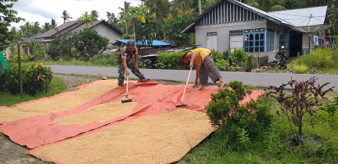 “Inilah yang terlihat saat Serda Darlius ikut serta membantu petani warga Desa binaannya, saat melakukan penjemuran padi hasil panen mereka”.