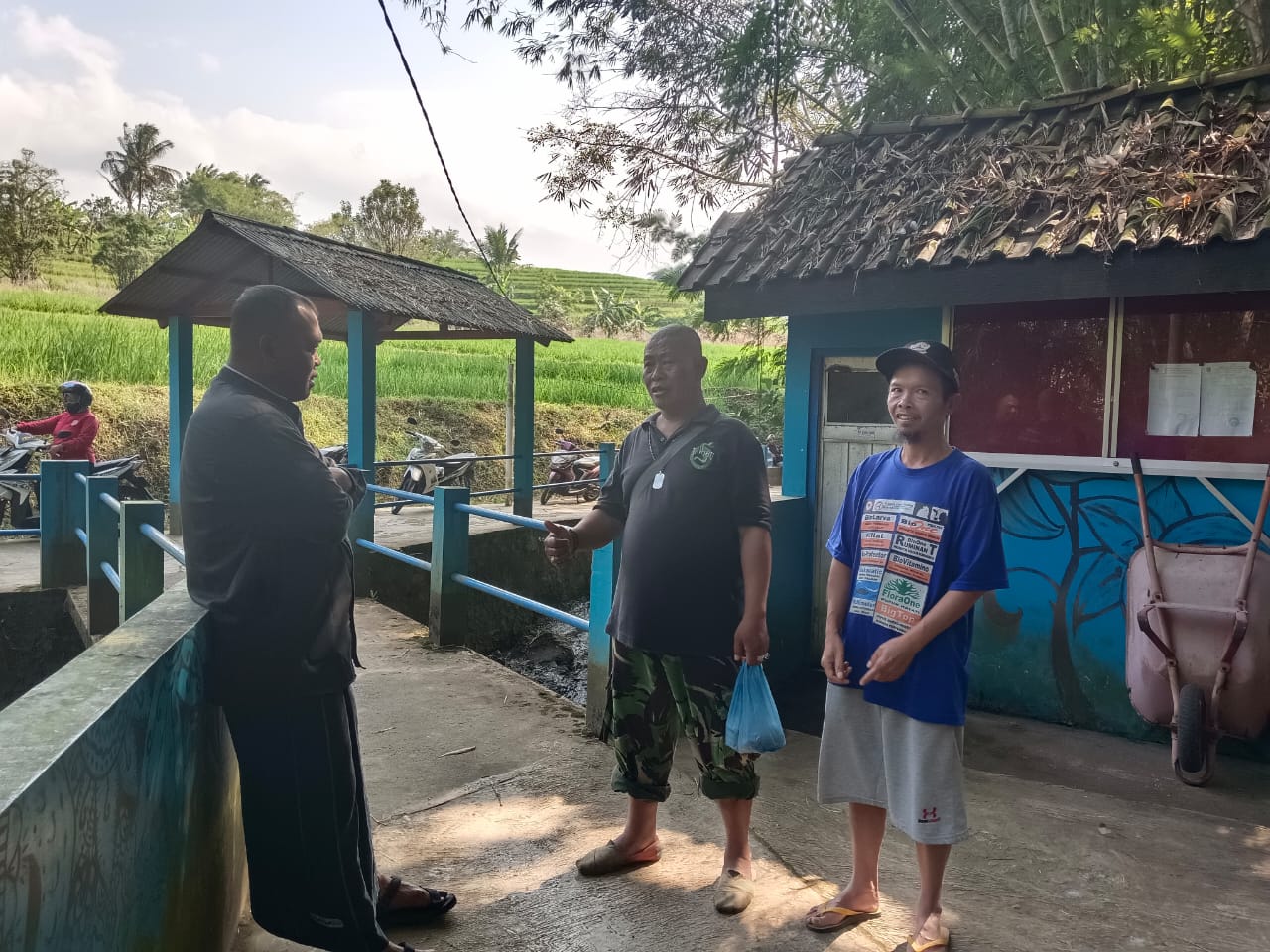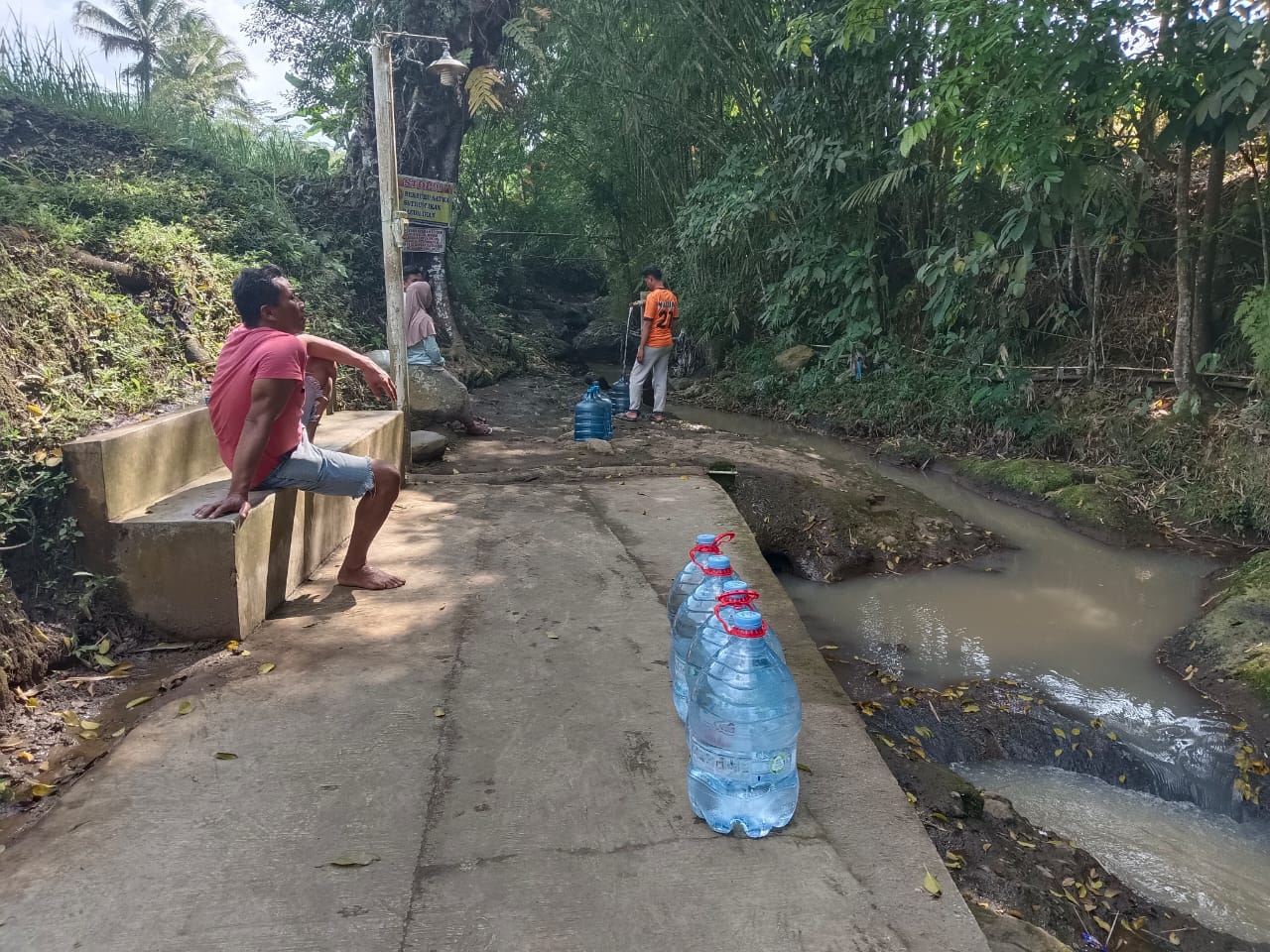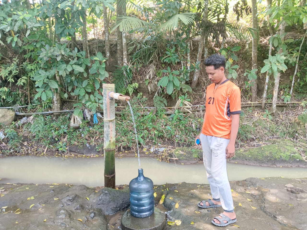 Air muncul dari celah batu dan disamping nya mengalir sungai yang keruh dengan media sebuah bambu besar setinggi 1.5 meter di tancapkan ke celah batu air di alirkan ke atas supaya bisa di manfaatkan oleh masyarakat yang membutuhkan.