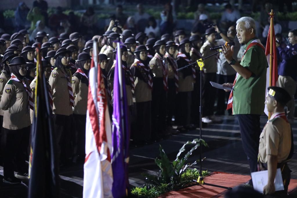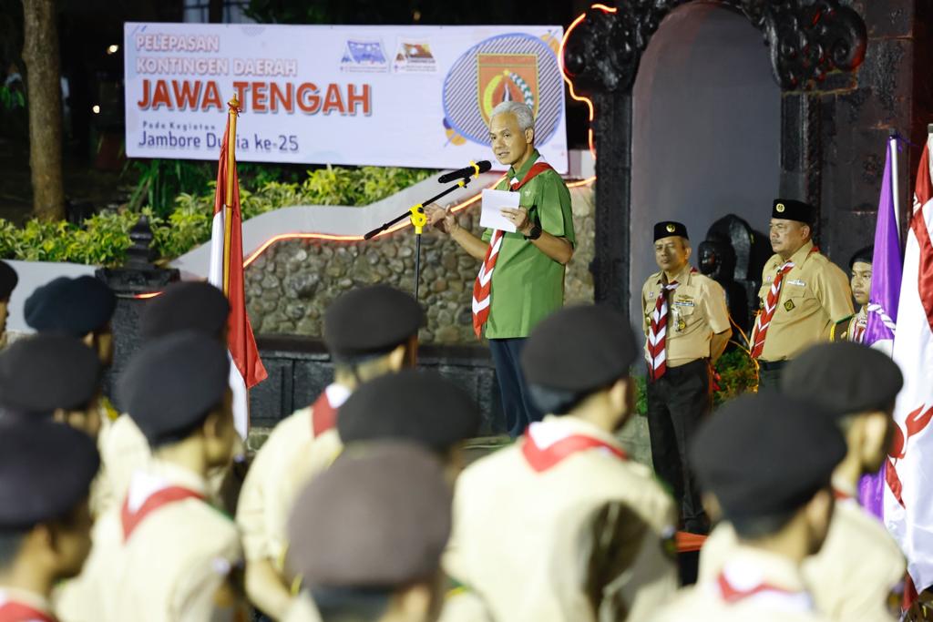 JAKARTA – Gubernur Jawa Tengah, Ganjar Pranowo meminta anggota Pramuka Jawa Tengah agar turut serta menyebarkan pesan damai kepada seluruh dunia. Hal itu disampaikan Ganjar saat melepas 218 anggota Pramuka Jateng, di Anjungan Jawa Tengah Taman Mini Indonesia Indah (TMII), Sabtu (29/7/2023) malam.
