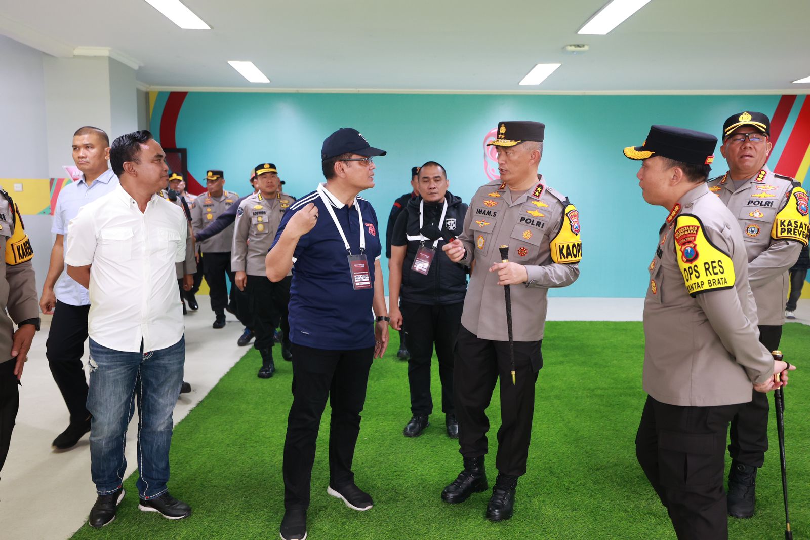 SURABAYA – Kapolda Jawa Timur Irjen Pol Imam Sugianto bersama Pejabat Utama Polda (PJU) Polda Jatim, meninjau kesiapan venue Piala Dunia 2023 FIFA U-17 di stadion Gelora Bung Tomo (GBT) Surabaya, pada Minggu (5/11/2023).