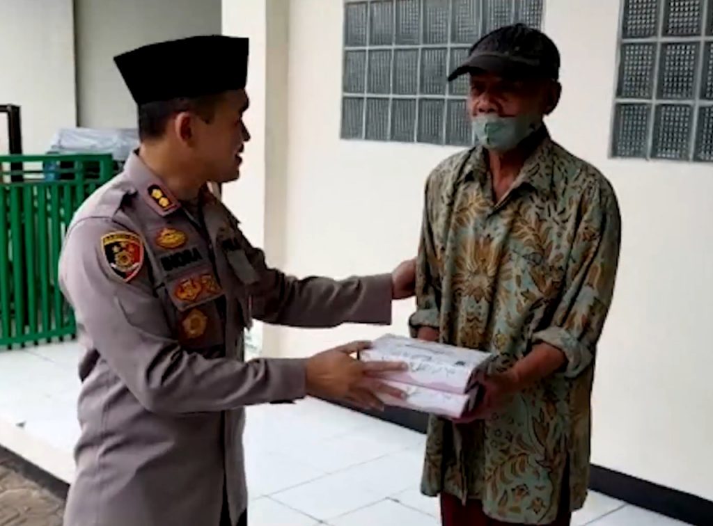 Didamping para Pejabat Utama Polres Sumedang, Kapolres membagikan Nasi Kotak kepada para pengemudi ojeg, pedagang asongan, PKL, pemulung dan warga yang melintas disekitar Masjid Al-Jabar Jatinangor dan Alun-alun Tanjungsari.