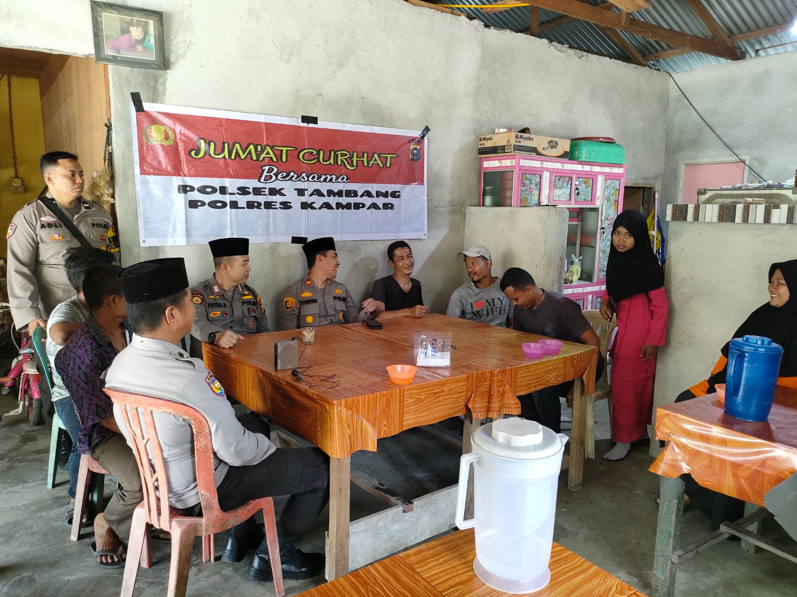 Kampar, Riau/medialidkkrimsus-.net. Jumat Curhat, Kapolsek Tambang, IPTU Mardani Tohenes, SH, MH bersama sejumlah personil Polsek Tambang diskusi terkait situasi Kamtibmas bersama warga masyarakat Dusun V Kedataran Desa Padang Luas Kecamatan Tambang Kabupaten Kampar, Jumat, (17/3/23), sekira pukul 10.20 WIB.