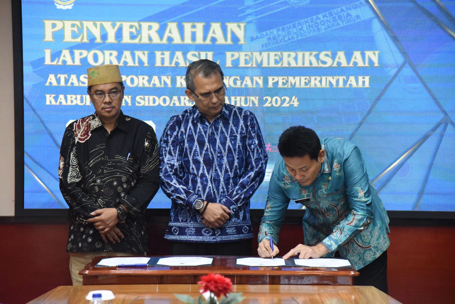 Pagi tadi, LHP LKPD Kabupaten Sidoarjo tahun 2024 itu diserahkan kepada Bupati Sidoarjo H. Subandi oleh Kepala BPK Perwakilan Provinsi Jawa Timur Yuan Candra Djaisin dikantor BPK Perwakilan Provinsi Jawa Timur, Kamis (17/4). LHP LKPD Kabupaten Sidoarjo tahun 2024 itu juga diserahkan kepada Ketua DPRD Kabupaten Sidoarjo Abdilah Nasih. Dalam penyerahannya Bupati Sidoarjo H. Subandi didampingi Sekda Sidoarjo Fenny Apridawati serta Inspektur Kabupaten Sidoarjo Andjar Surjadianto dan Kepala Badan Pengelolaan Keuangan dan Aset Daerah (BPKAD) Kabupaten Sidoarjo Chusnul Inayah.