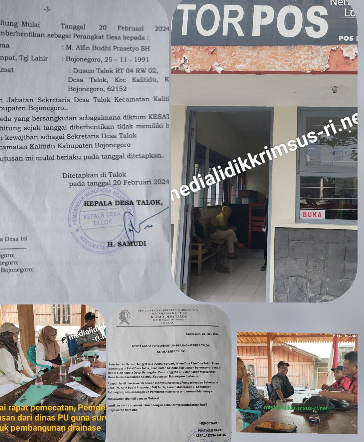 Bojonegoro Jatim, medialidikkrimsus-ri.net // Semenjak terjadinya ketidakharmonisan antara Kepala Desa (Kades) Talok, H. Samudi dengan Sekretaris Desa (Sekdes) Talok, M. Alfin Budhi Prasetyo, S.H, jalannya Pemerintahan Desa ( Pemdes) Talok, Kecamatan Kalitidu, Kabupaten Bojonegoro, Jawa Timur, tampaknya semakin menjadi polemik masyarakat luas kabupaten Bojonegoro. Pasalnya hingga saat ini masih belum juga selesai. Salah satunya terkait proses pemecatan perangkat desa Sekdes yang konon berbagai usaha telah dilakukan oleh Pemdes Talok,