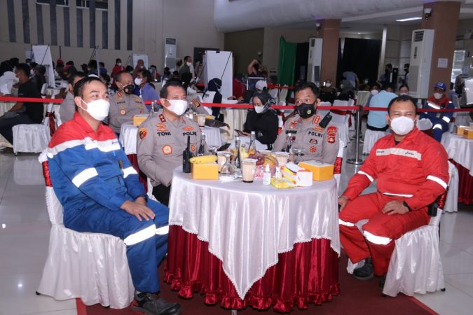medialidikkrimsus-ri.net, Sumsel – Kapolda Sumsel Irjen Pol. Drs. Toni Harmanto, M.H. didampingi Karoops Polda Sumsel Kombes Pol. Drs. Kamaruddin, M.Si. meninjau pelaksanaan vaksinasi massal serentak Indonesia bertempat di Gedung Ogan RU III PT. Pertamina Plaju Palembang.