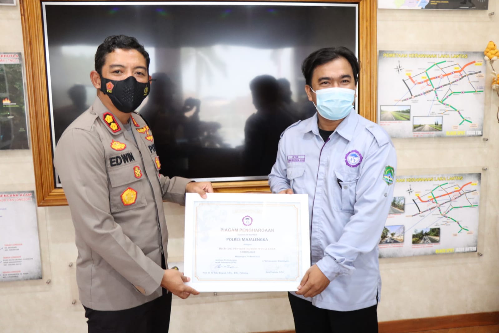 Majalengka – medialidikkrimsus-ri.net – Kapolres Majalengka AKBP Edwin Affandi didampingi Kasat Reskrim AKP Febri H. Samosir terima pemberian penghargaan dari Ketua Lembaga Perlindungan Anak Indonesia (LPAI) Kabupaten Majalengka sebagai Institusi Penegakan Hukum Peduli Anak 2022 bertempat di ruang kapolres majalengka, senin (21/03/2022).