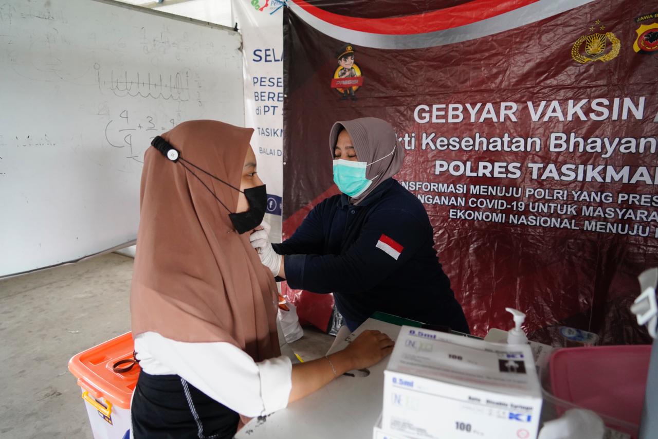Sementara itu Kapolres Tasikmalaya Kota AKBP Aszhari Kurniawan, SH., S.I.K., M.Si. didampingi Perwakilan PT. SanSan Saudaratex Jaya Hasanudin, menyampaikan terimakasih atas partisipasi perusahaan dalam pelaksanaan Gebyar Vaksin Presisi.