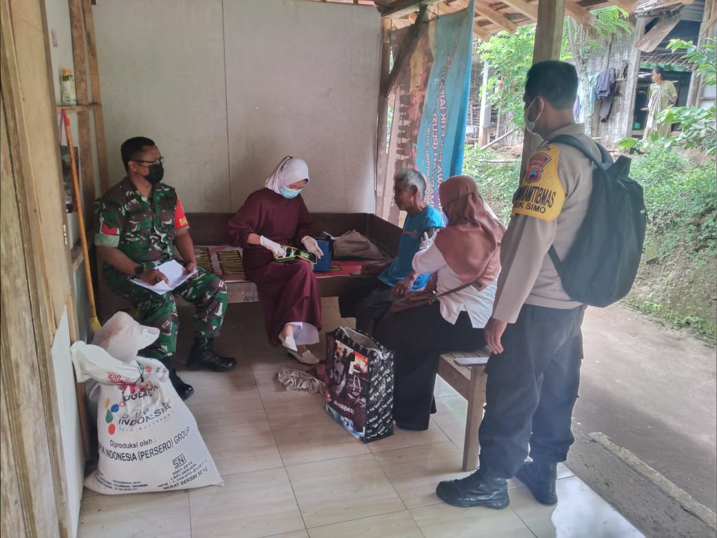 LIDIK KRIMSUS RI – Boyolalali – Babinsa Kedunglengkong Koramil 12/Simo Kodim 0724/Boyolali Koptu Muhammad Nuryanto Bersama Babinkamtibmas Polsek Simo Bripka Sutikno mendampingi petugas kesehatan melaksanakan vaksinasi secara door to door dosis ke 2 untuk lansia. Vaksinasi ini dilaksanakan petugas medis di wilayah Kadus I dan Kadus II Desa Kedunglengkong Kecamatan Simo Kabupaten Boyolali. Selasa (25/01/2022).
