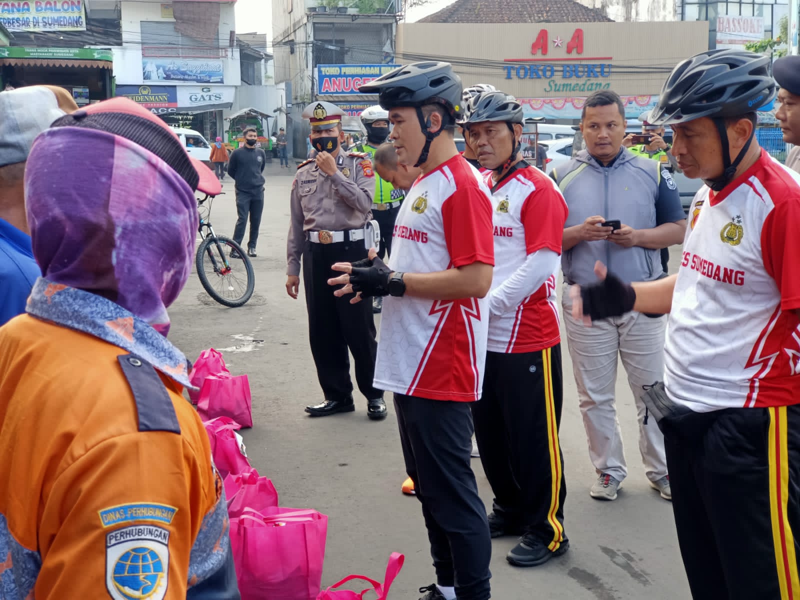 Selain Fun Bike, Kapolres Sumedang AKBP Indra Setiawan juga membagikan baksos berupa sembako kepada Ojeg Ciakar, Ojeg Jatihurip dan para pedagang di Taman Endog.