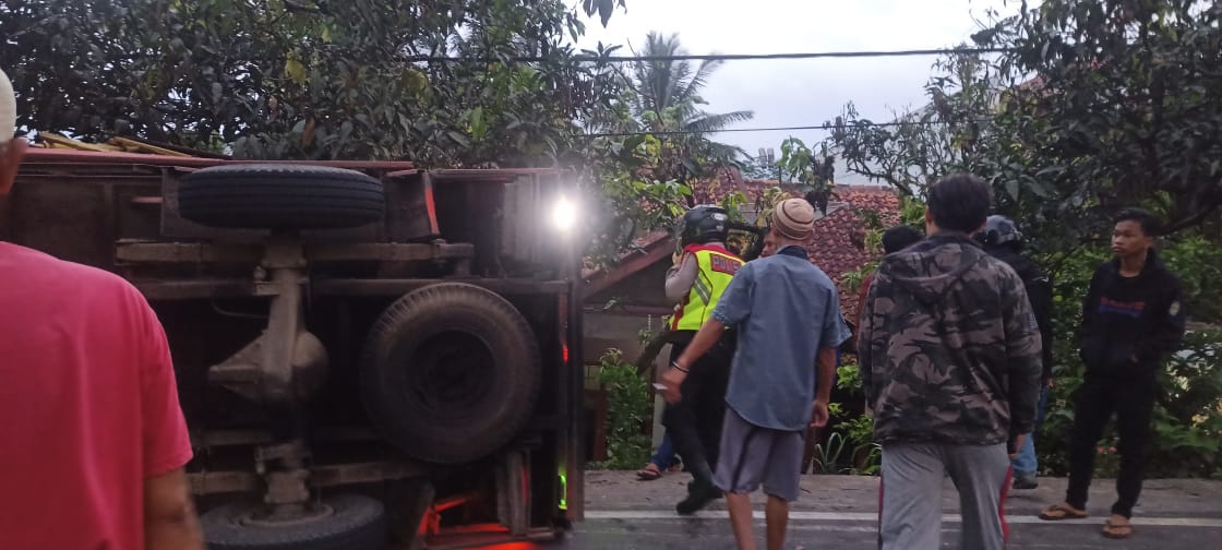 “Kejadiannya saat truk box oleng dan menabrak samping kanan dump truk pasir  dari arah berlawanan kemudian truk box terguling ke kanan dan menimpa pengendara sepeda motor yang datang dari arah Tasikmalaya menuju Bandung,” ungkapnya