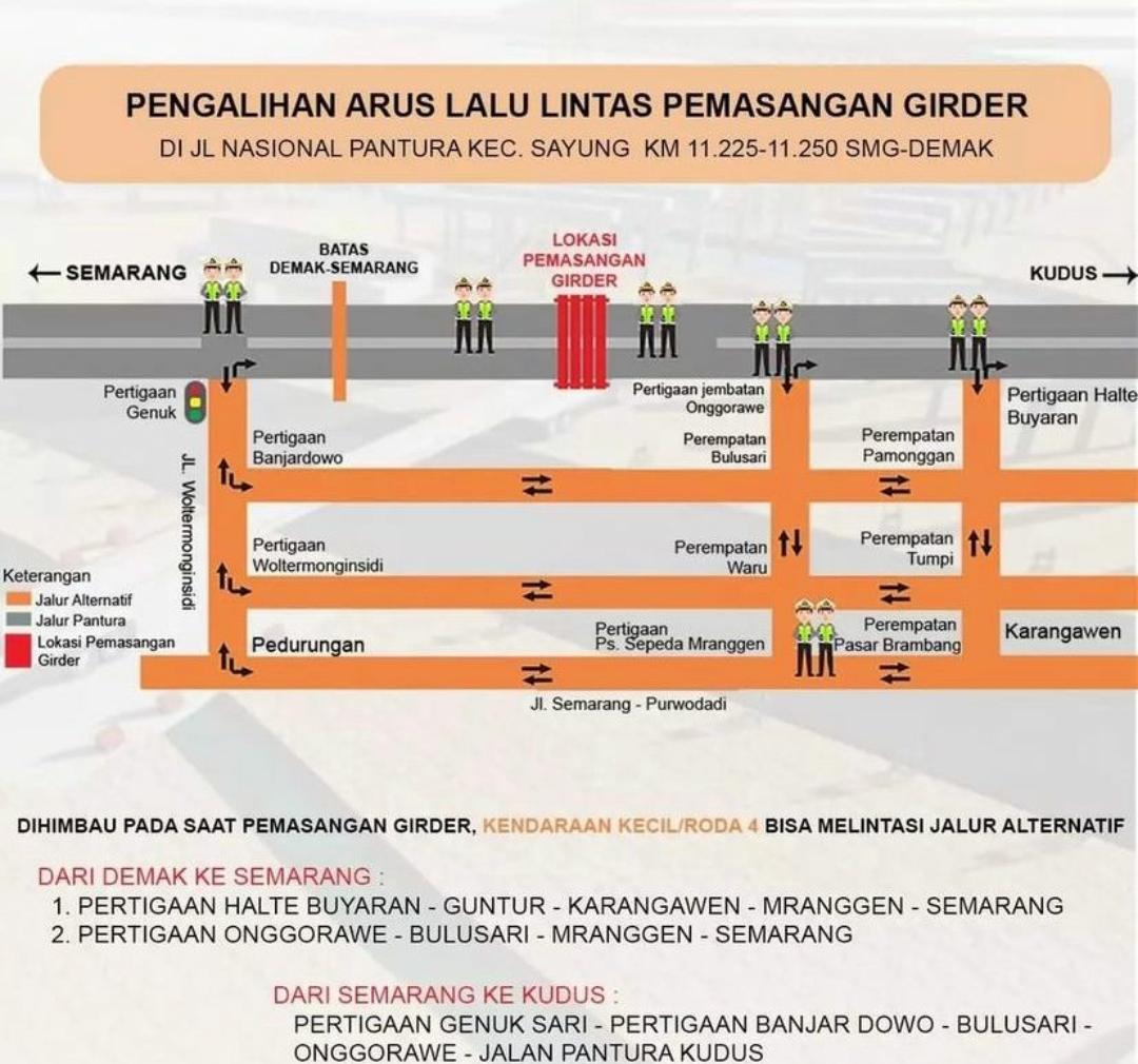 Kapolres Demak AKBP Budi Adhy Buono mengatakan, pihaknya melakukan pengalihan untuk mendukung pembangunan Jalan Tol Semarang – Demak pada tanggal 11 sampai 14 Maret 2022 yang memasuki tahap pemasangan Girder.