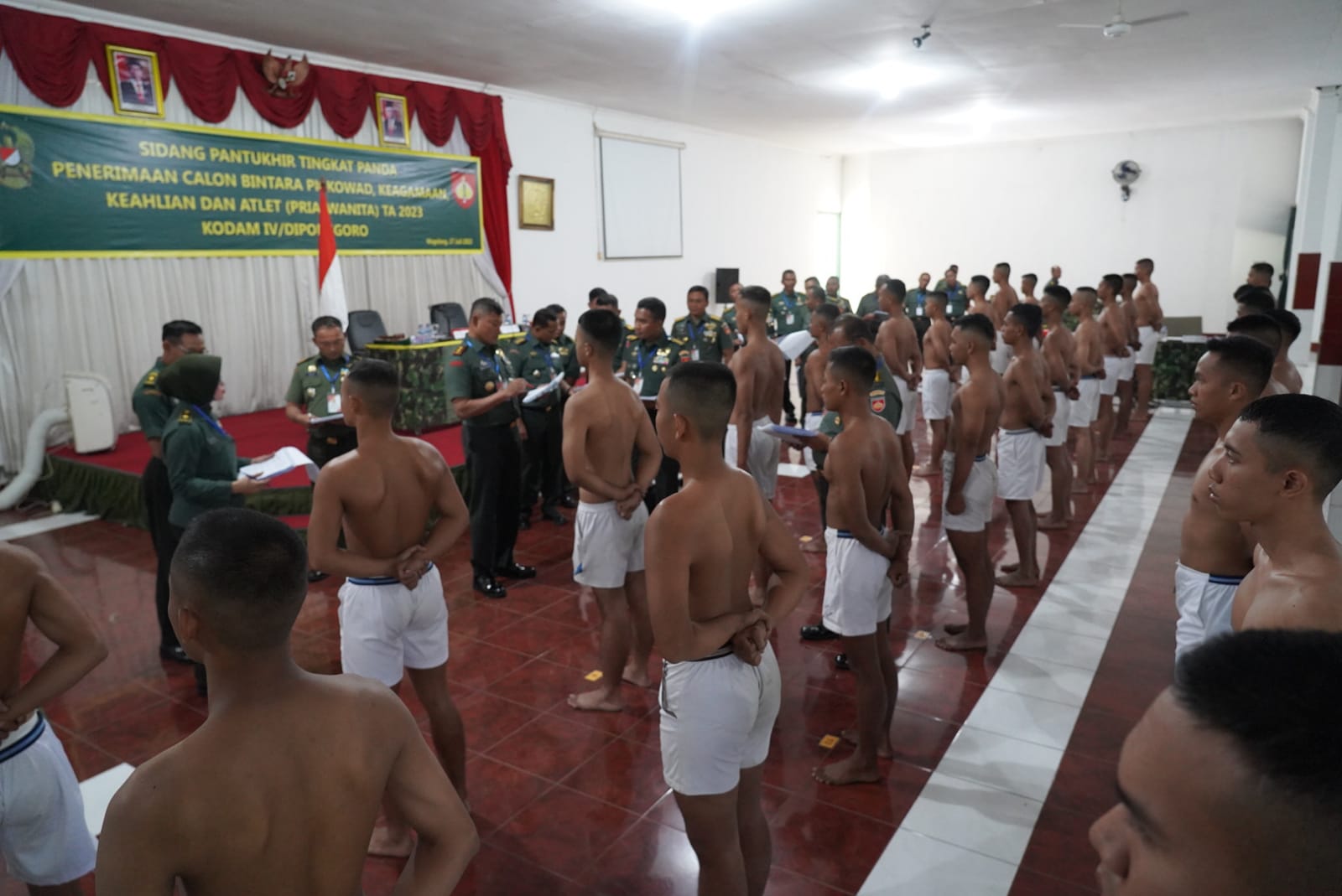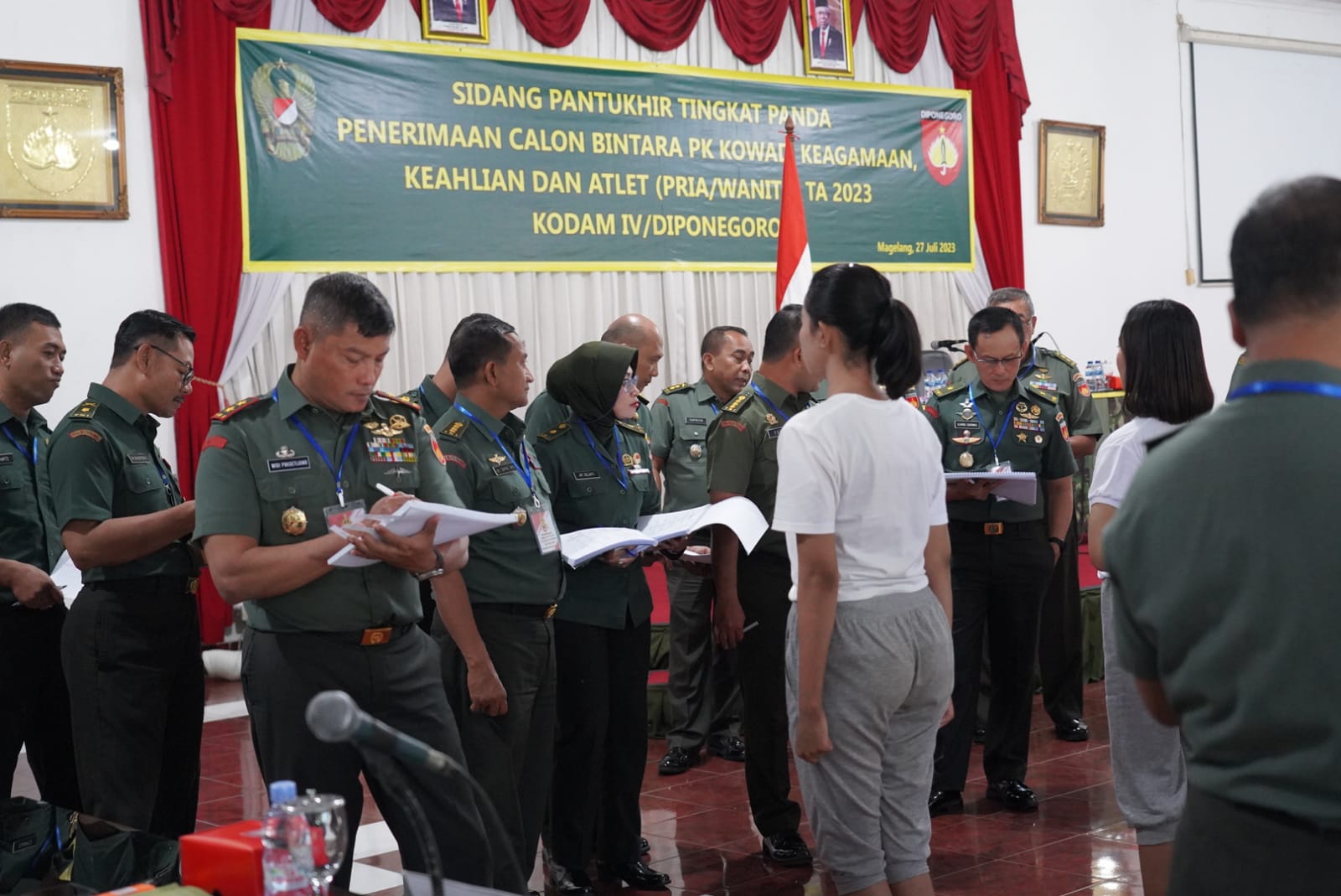 Pangdam IV/Diponegoro Mayjen TNI Widi Prasetijono memimpin pelaksanaan sidang Pantukhir Tingkat Panda Penerimaan Calon Bintara Prajurit Karier (Caba PK) Kowad, Keahlian, Keagamaan, dan Atlet (Pria/Wanita) TNI AD TA 2023 untuk wilayah Kodam IV/Diponegoro bertempat di Aula Mako Rindam IV/Diponegoro pada Kamis (27/7/2023).