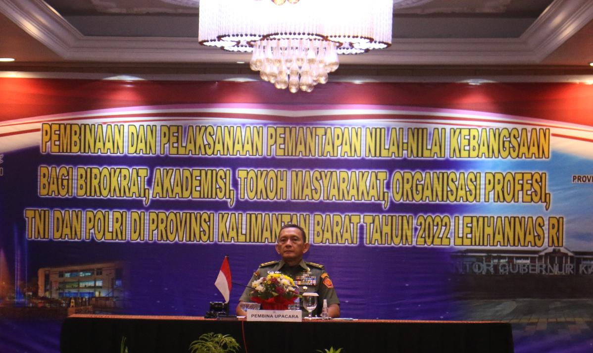 Pontianak – medialidikkrimsus-ri.net – Selasa (7/6/22) – Panglima Kodam XII/Tanjungpura, Mayjen TNI Sulaiman Agusto, S.I.P., M.M., menghadiri kegiatan pembukaan Pembinaan dan Pelaksanaan Pemantapan Nilai-nilai Kebangsaan Bagi Birokrat, Akademisi, Tokoh Masyarakat, Organisasi Profesi, TNI dan Polri di Provinsi Kalimantan Barat Tahun 2022 oleh Lembaga Ketahanan Nasional Republik Indonesia bertempat di Ballroom Hotel Mahkota, Kota Pontianak.
