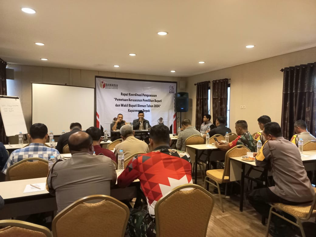 Ketua Panwaslu Kecamatan Depok, Hari Jumanto, SS. M,Si menjelaskan Rapat Koordinasi ini bertujuan untuk melakukan pemetaan kerawanan dalam rangka Pemilihan Bupati dan Wakil Bupati Sleman Tahun 2024 yang dihadiri oleh berbagai pihak terkait seperti Panewu Depok, Polsek Depok Barat, Polsek Depok Timur, Polsek Depok Bulaksumur, Koramil 11 Depok, Babinsa dan Babinkamtibmas se- Kapanewon Depok termasuk perwakilan dari instansi pemerintah, penegak hukum dan lembaga pengawas pemilu.