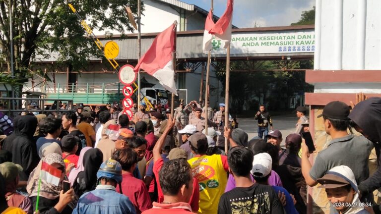 27 Juni 2023.Ratusan warga terdampak diwilayah Dander Kelurahan Ketami Kecamatan Pesantren Kota Kediri dan Desa Tugurejo Kecamatan Ngasem Kabupaten Kediri, menggelar aksi demo di depan Pabrik Gula (PG) Pesantren Baru Kota Kediri, pada Selasa pagi (27/6/2023).