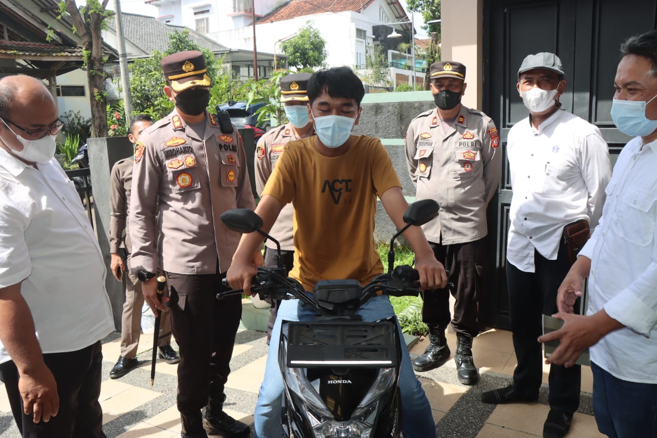 Kapolres Garut AKBP Wirdhanto Hadicaksono S.I.K., M.Si. pada hari Rabu tanggal 25 Mei 2022 dimulai pukul 10.00 Wib bertempat di Perum Griya Bumi Praja Blok A no 21 Desa Rancabango Kecamatan Tarogong Kaler Kabupaten Garut, telah dilaksanakan kegiatan pengembalian barang bukti satu unit kendaraan roda dua merk Honda beat hasil curanmor kepada pemiliknya. dengan lokasi TKP Depan STKIP Jl. Terusan Pahlawan Kel. Sukagalih Kec. Tarogong Kidul Kab. Garut.