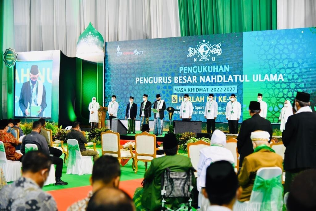 “Atas nama pemerintah dan bangsa Indonesia, saya menyampaikan selamat kepada seluruh pengurus PBNU massa khidmat Tahun 2022 sampai dengan tahun 2027 di bawah kepemimpinan Rais Aam Bapak K.H. Miftachul Akhyar dan Ketua Umum PBNU Bapak K.H. Yahya Cholil Staquf,” tutur Presiden.