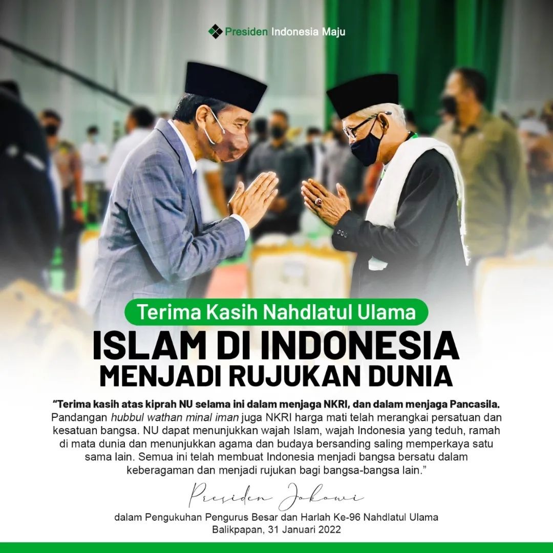 Presiden Joko Widodo mengapresiasi kiprah Nahdlatul Ulama (NU) dalam menjaga Negara Kesatuan Republik Indonesia (NKRI) dan Pancasila. Apresiasi tersebut disampaikan Kepala Negara dalam sambutannya saat menghadiri Pengukuhan Pengurus Besar Nahdlatul Ulama (PBNU) Masa Khidmat 2022-2027 dan Harlah Ke-96 NU yang digelar di Balikpapan Sport and Convention Center, Kota Balikpapan, Provinsi Kalimantan Timur, pada Senin, 31 Januari 2022.