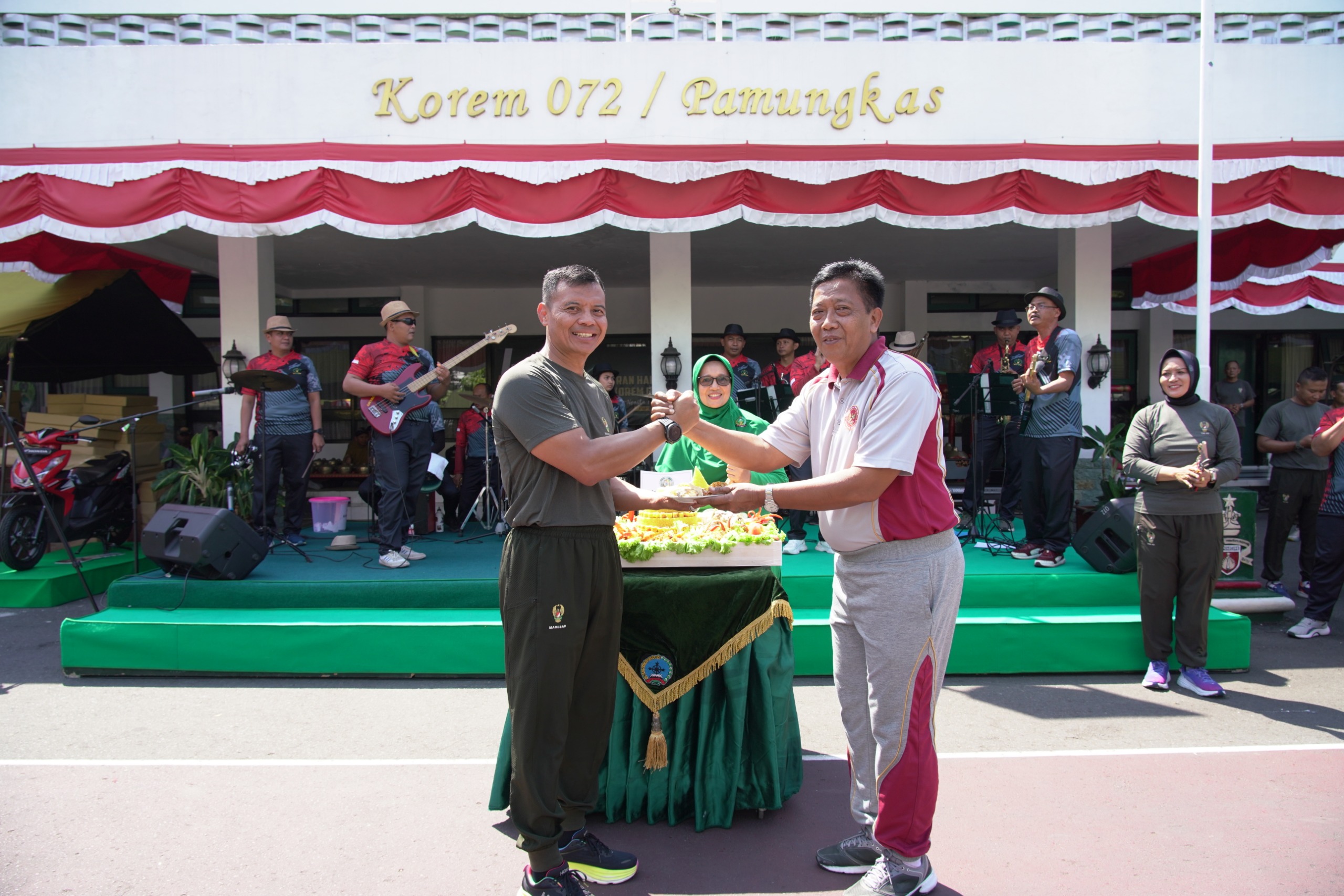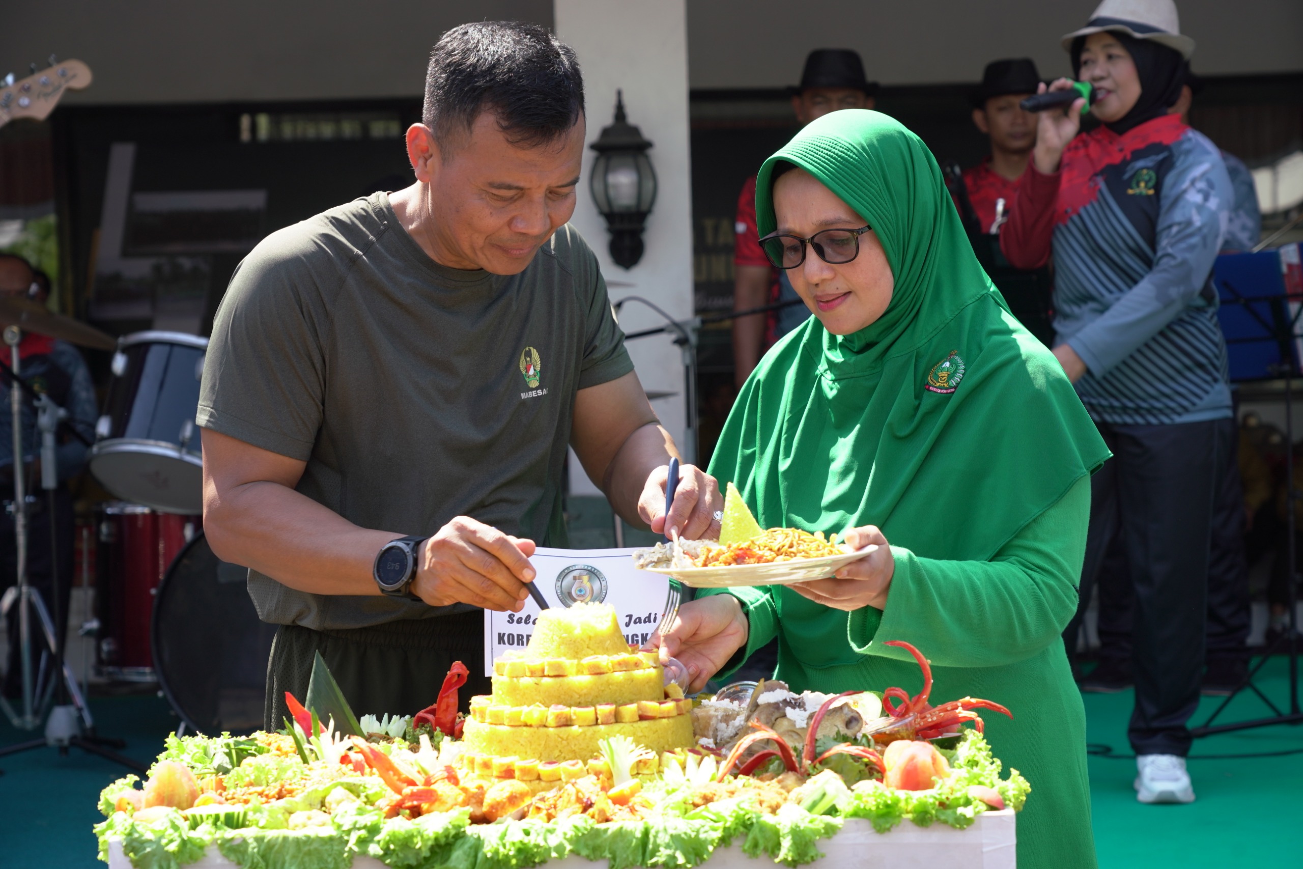 Danrem 072/Pamungkas Brigjen TNI Zainul Bahar S.H., M.Si., didampingi Ketua Persit KCK Koorcab 072 PD IV/Diponegoro Ny. Kemala Zainul Bahar, melakukan pemotongan tumpeng yang kemudian diserahkan kepada PNS Sri Wahyudi anggota Makorem yang mendekati masa pensiun.