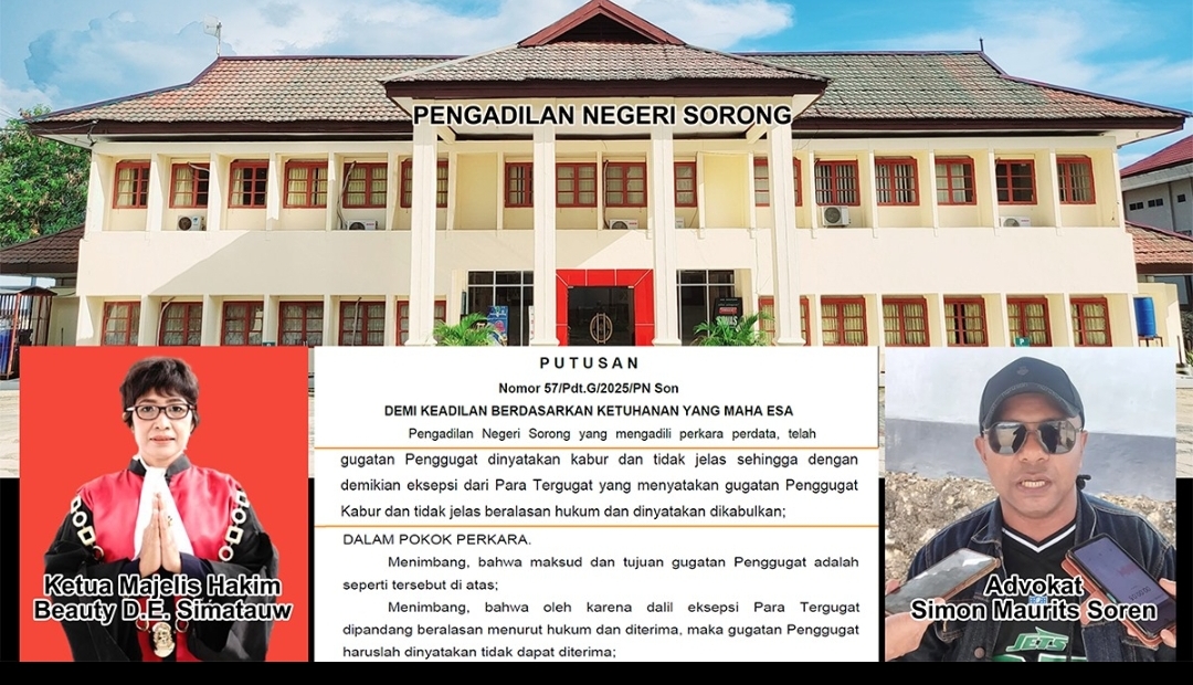 Hal itu disampaikan ketua Tim Pengacara tergugat, Advokat Simon Maurits Soren, S.H., M.H., kepada media ini, Senin, 22 September 2025. Setelah melalui proses persidangan panjang di PN Sorong, akhirnya Majelis Hakim memutuskan menerima eksepsi tergugat dan menolak dengan tegas gugatan pihak penggugat.