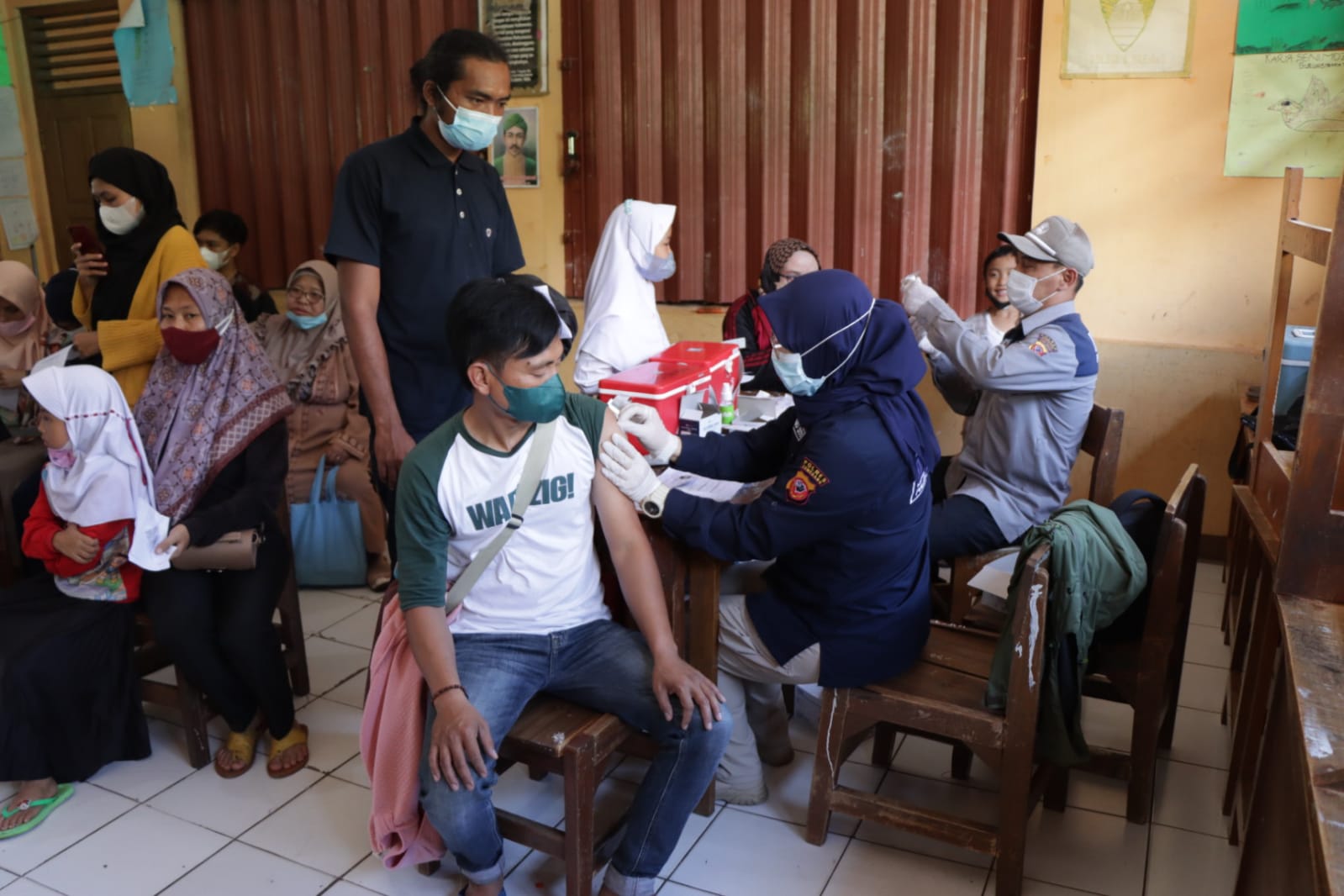Kegiatan Vaksinasi Covid-19 di MI Raudlatul Muta’alimin Jatinangor berlangsung dengan aman, tertib dan lancar serta menerapkan Protokol Kesehatan Covid-19 guna mencegah penyebaran Virus Covid-19.