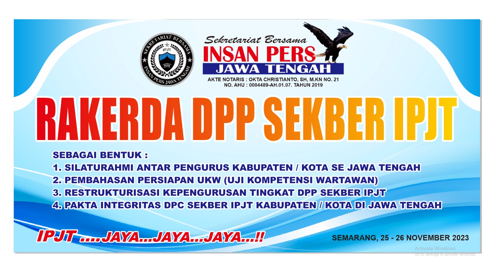 Semarang. medialidikkrimsus-ri.net – Seketariat Bersama Insan Pers Jawa Tengah ( SEKBER IPJT) akan menggelar Rapat Kerja Daerah ( Rakerda) 1 DPP tingkat Jawa Tengah besok pada, ( 25 – 26 Nopember 2023) diikuti oleh lebih kurang 100 peserta yang akan hadir, bertempat di Gedung DPRD Propinsi Jawa Tengah yang beralamat,Jl.Pahlawan No.7 Mugasari, Kecamatan Semarang Selatan, Kota Semarang.