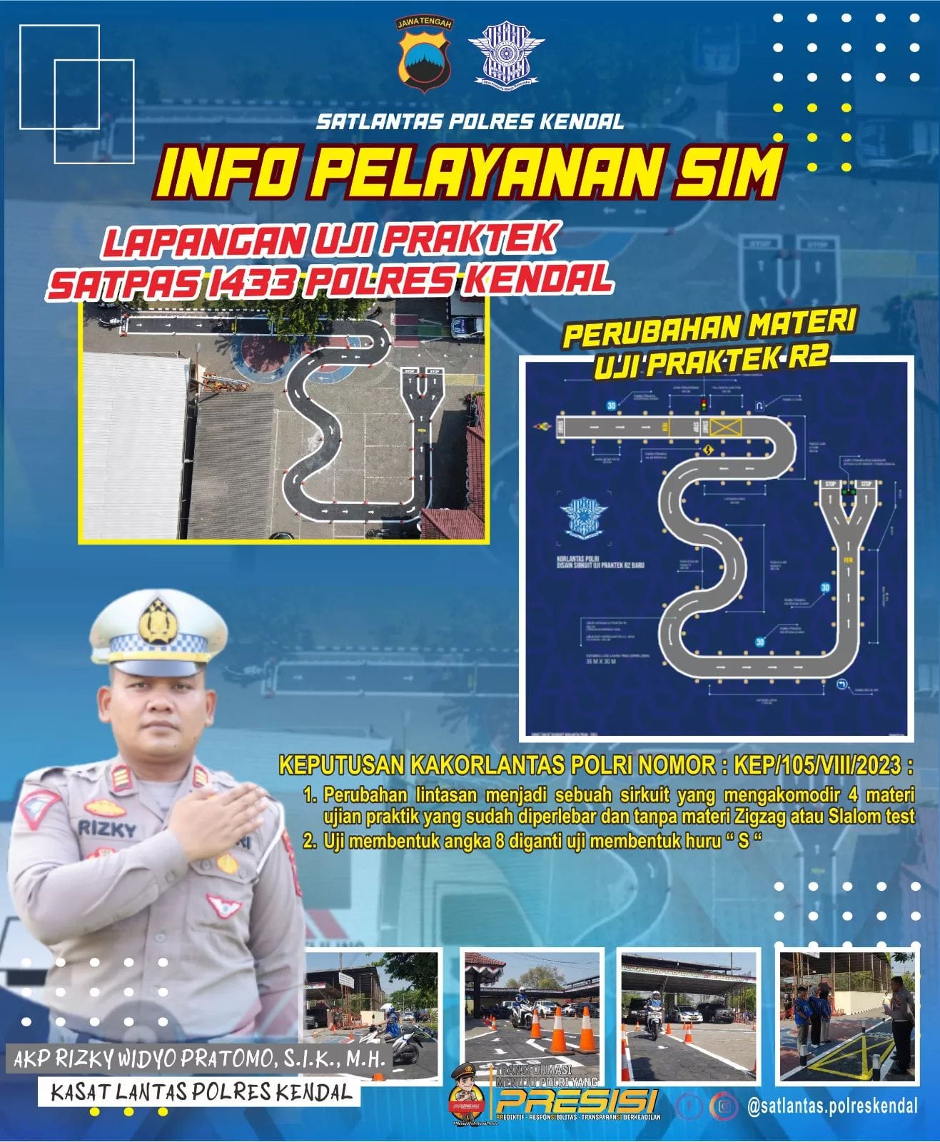 “Lintasan Model baru ini yang kami sudah bangun oleh pihak satlantas polres Kendal diyakini akan memudahkan masyarakat dalam mengikuti ujian praktik SIM tanpa mengurangi standar kompetensi berkendara menurut Polri, Perubahan yang diterapkan meliputi lintasan ujian yang diubah menjadi sirkuit dengan tiga lintasan lurus dan lima area berbelok, salah satunya menyerupai huruf S sebagai pengganti angka 8,” jelas AKP Rizky Widyo Pratomo.