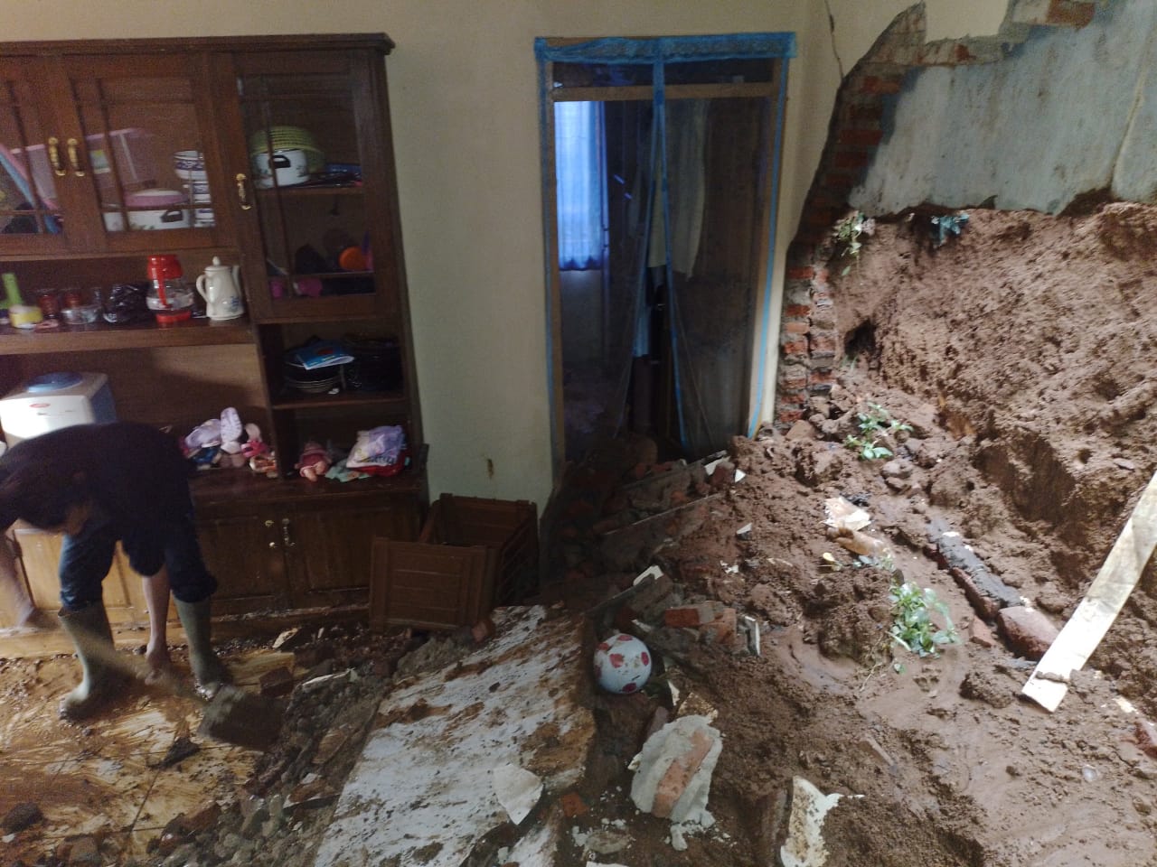 Longsoran tanah setinggi 5 tersebut menimpa dinding tembok rumah yang mengakibatkan tembok jebol dan bongkahan tanah masuk ruangan rumah.